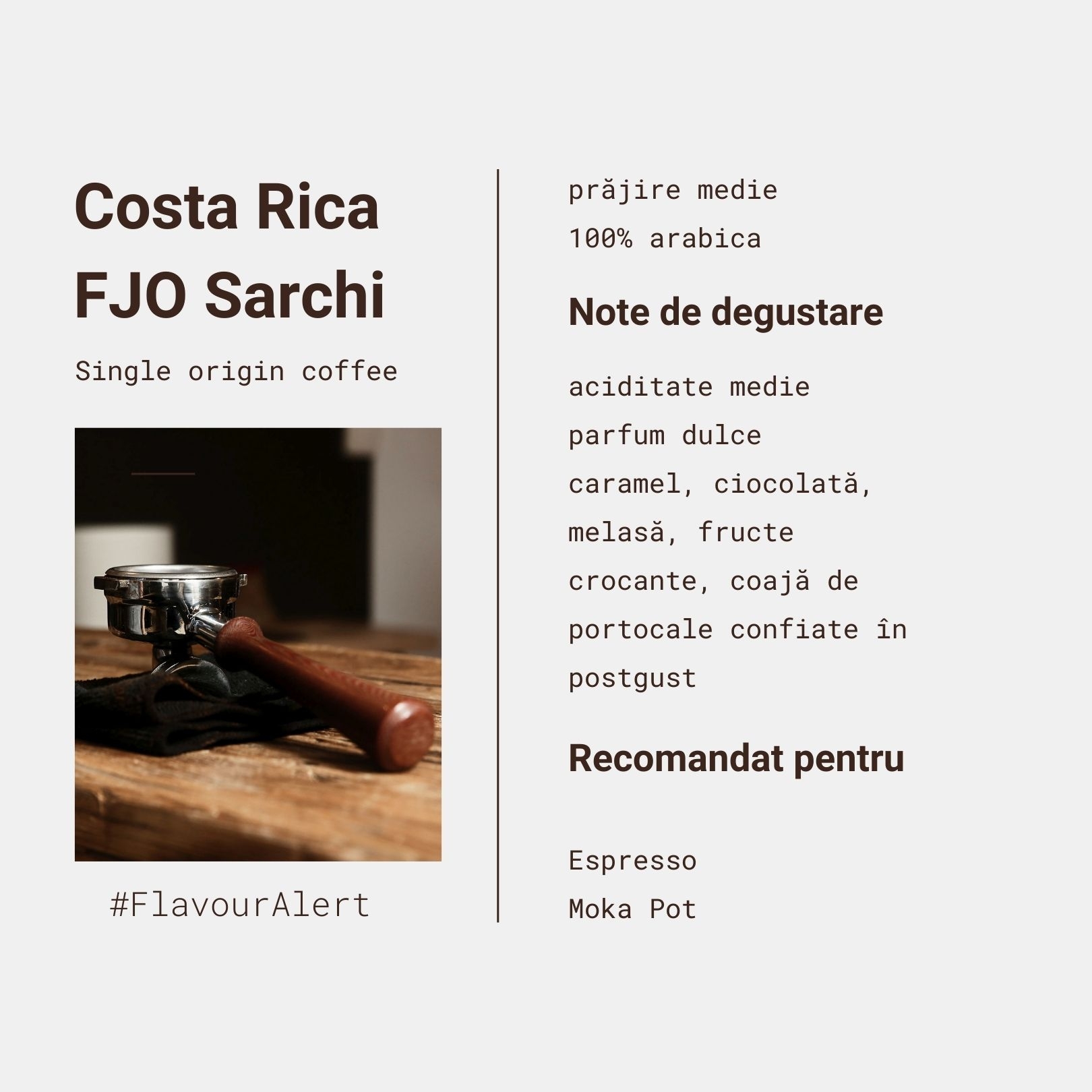 Cafea de origine din Costa Rica, cultivată la altitudini mari și prăjită la Cluj. Parfum dulce și arome intense de zahăr caramelizat, melasă și ciocolată.
