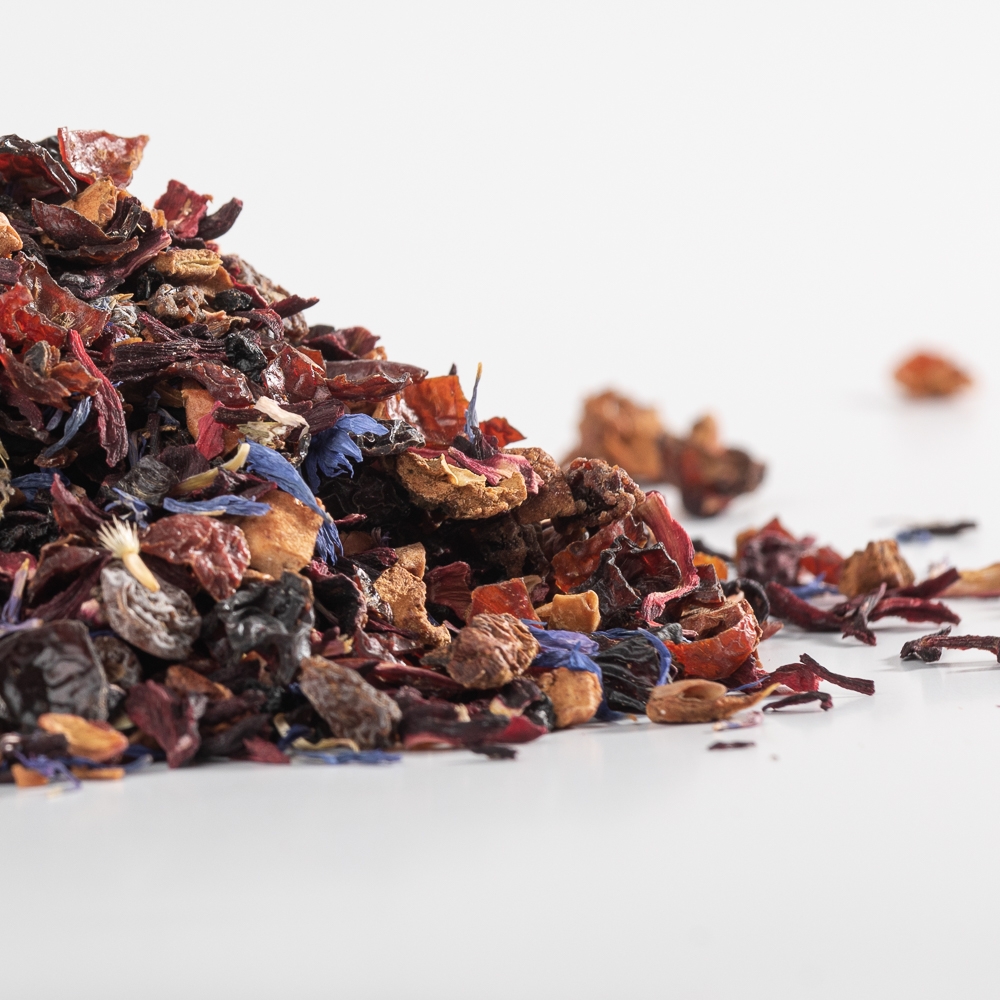 Ceai de fructe: amestec de hibiscus, coajă de măceșe, mere, struguri, coacăze negre (100 gr)